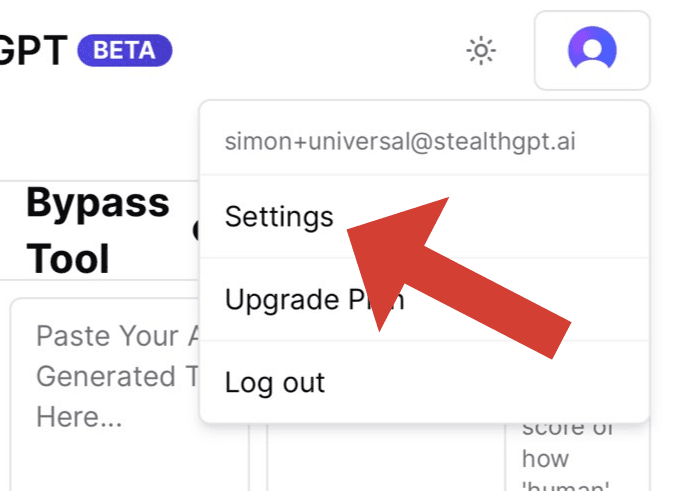 After you finish logging into your StealthGPT account, a home page will appear. Pay attention to the right corner of the screen; a small purple icon appears. Click on that icon.