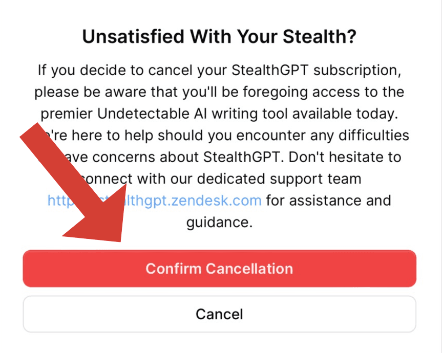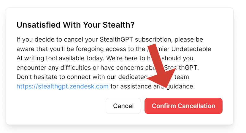 This will be the last step of the process; a small piece of information will pop up asking if you really want to unsubscribe your account from the StealthGPT. Click the button Confirm Cancellation to finalize the process.