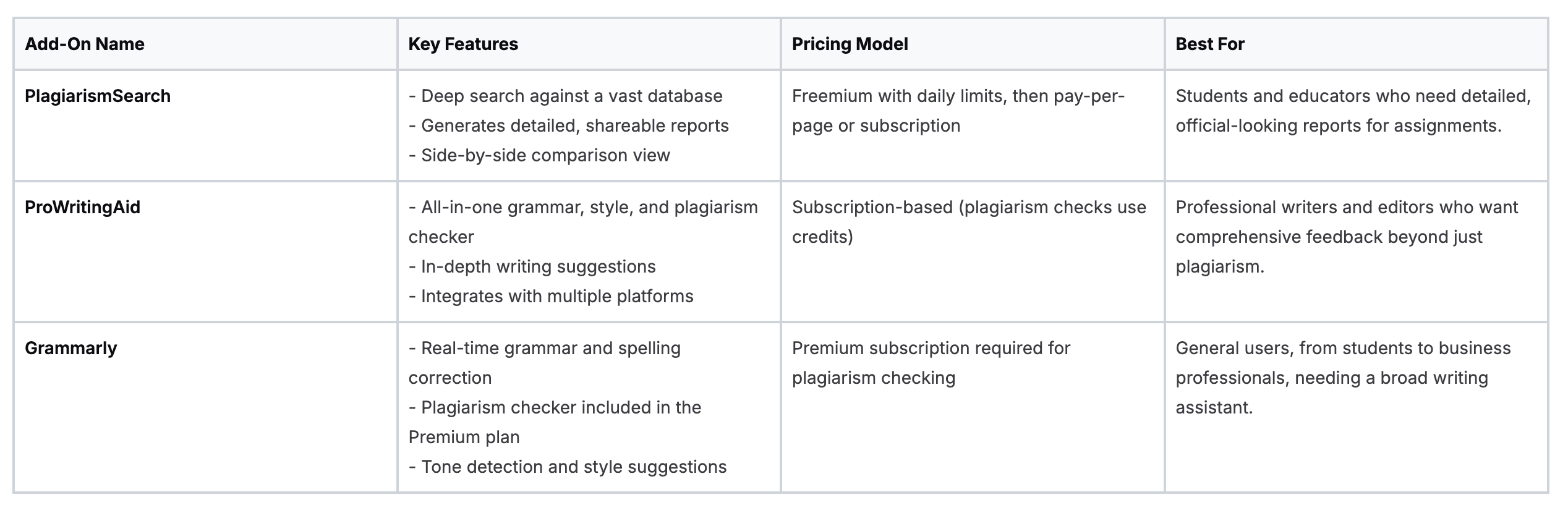 This table breaks down some of the most popular and reliable add-ons available in the Google Workspace Marketplace. Think of it as a cheat sheet to quickly see which tool aligns best with your needs, whether you're a student, a professional writer, or just someone who wants to ensure their work is original.