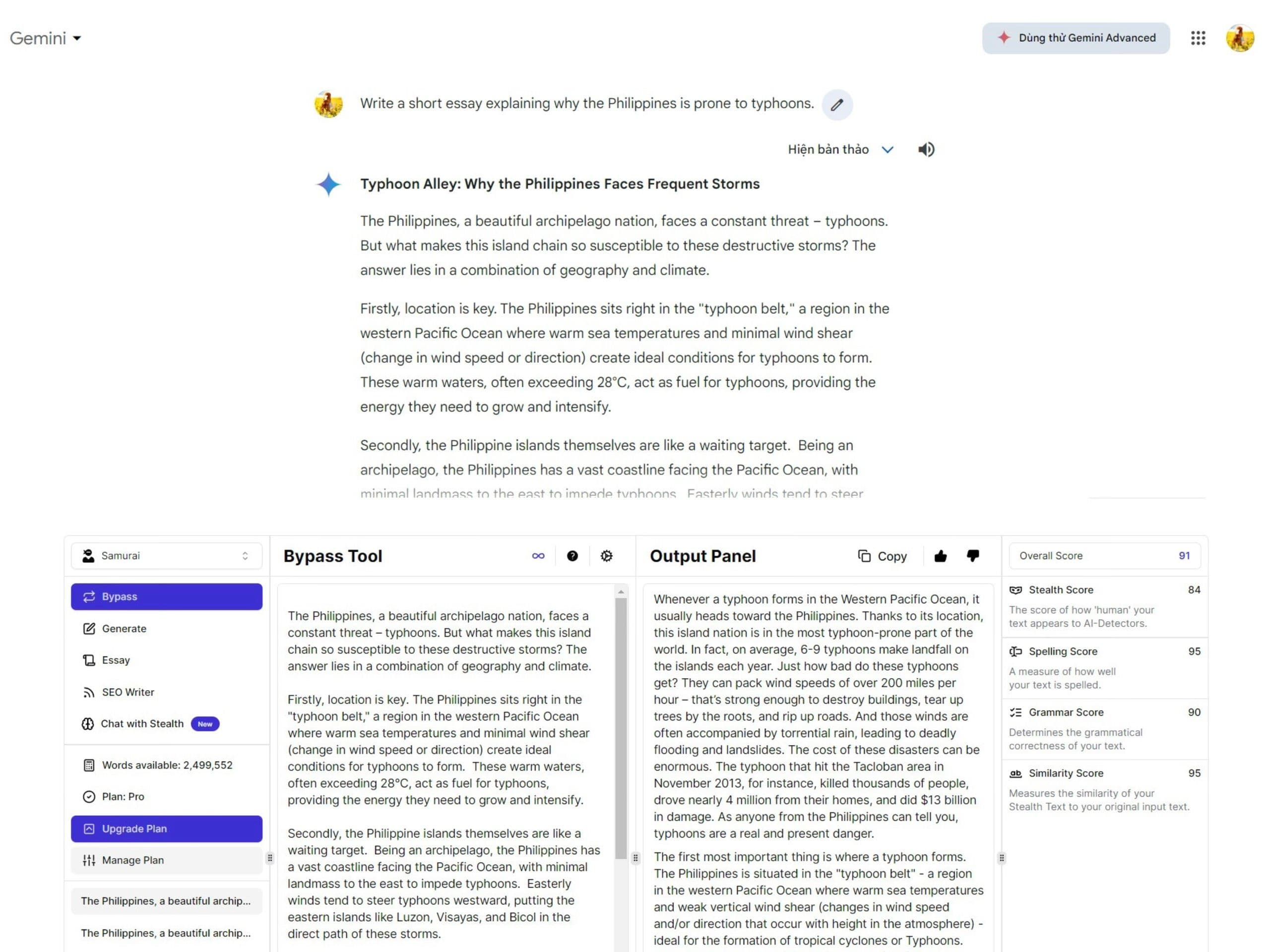 For example, let’s take our sample essay generated by using Google Gemini and was run through the Stealth Bypass tool, setting “medium” mode as well as “academic” writing tone to rewrite the content.