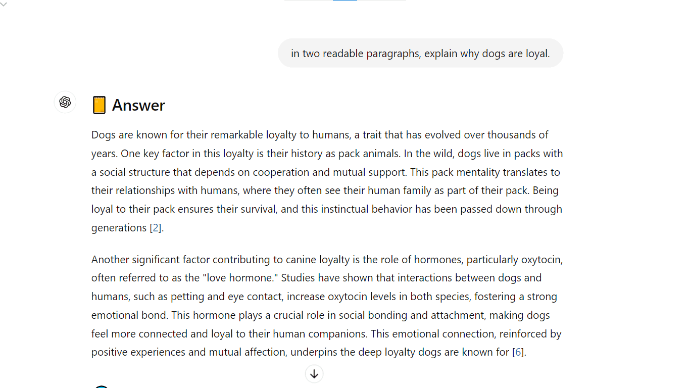 To get the output in the second screenshot, we asked ChatGPT to write two paragraphs explaining why dogs are loyal. Then, we prompted it to make the content easy to understand.