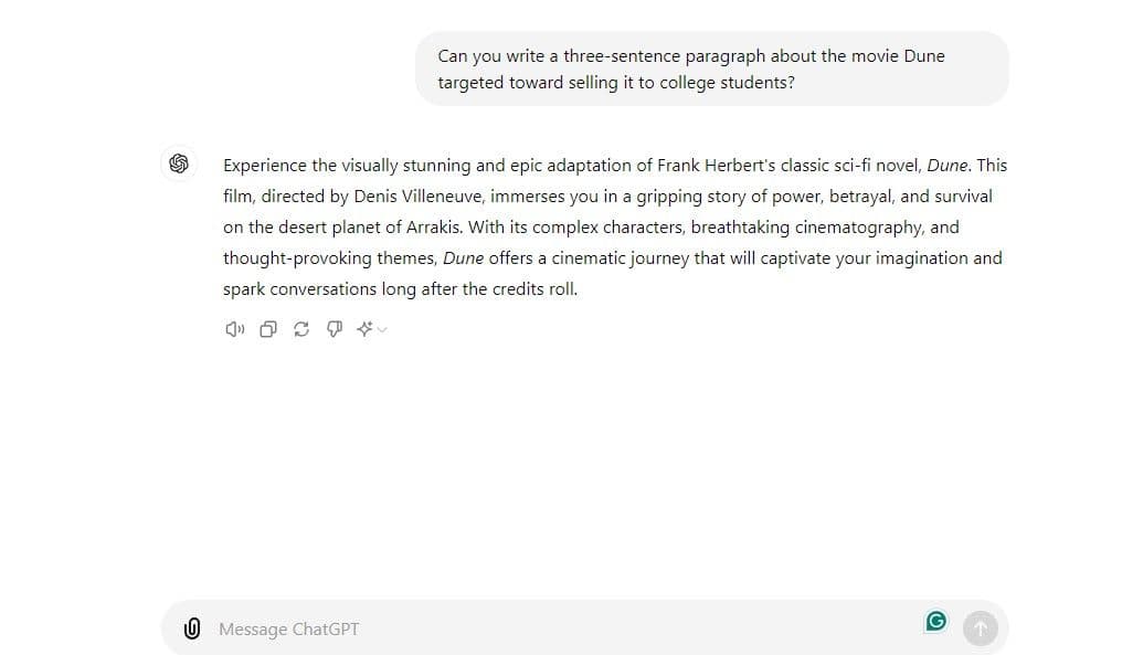 Lets say you're starting in ChatGPT like in the sample below. I'm going to tell it to give me a description of the box-office smash hit "Dune" and gear it toward college students: