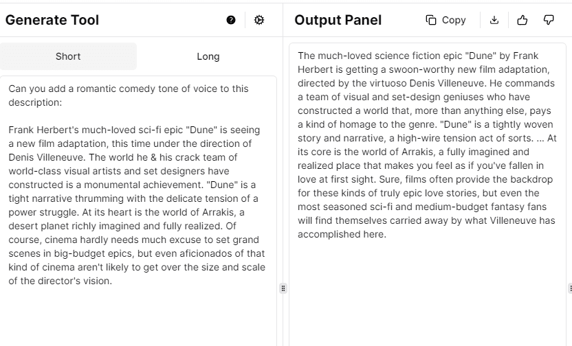 As far as our prompts go, lets ask StealthGPT to gear our tone towards lovers of romantic comedies.