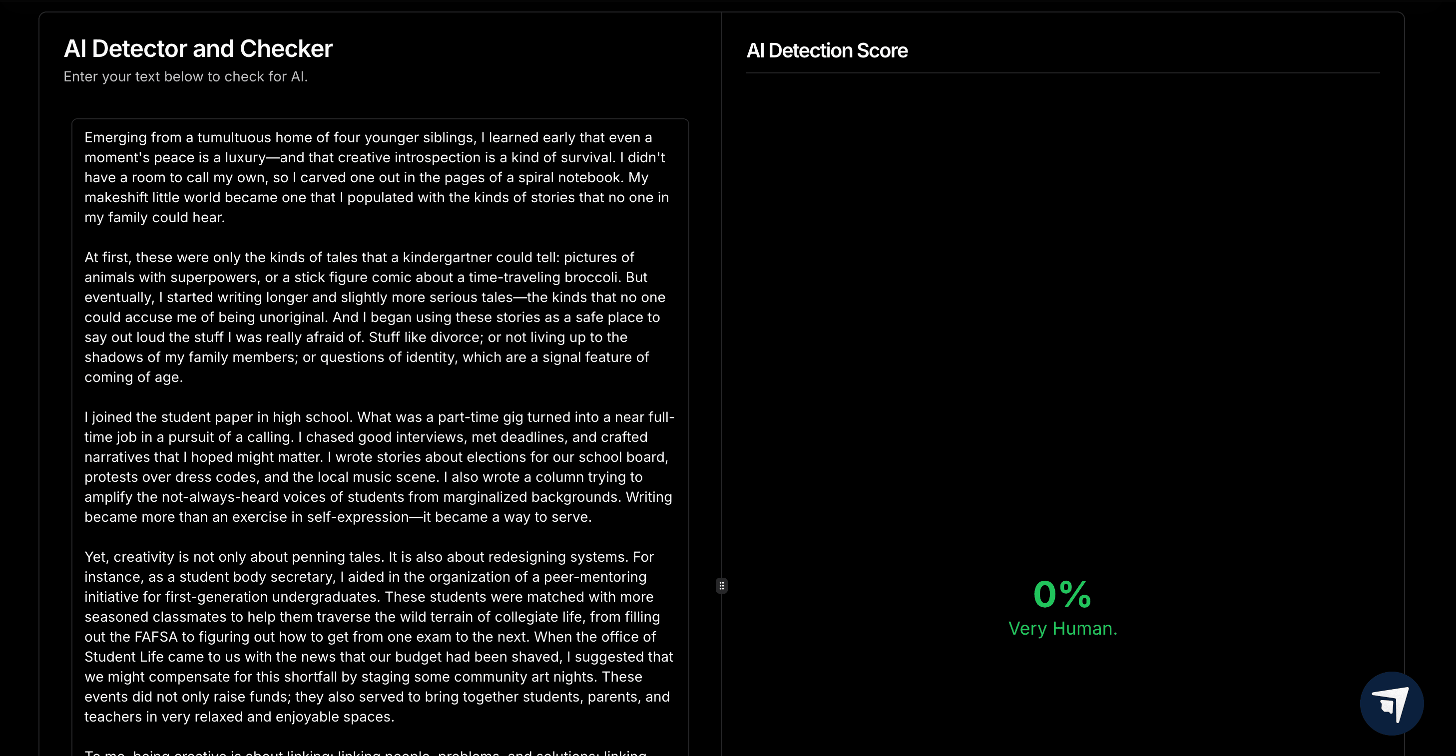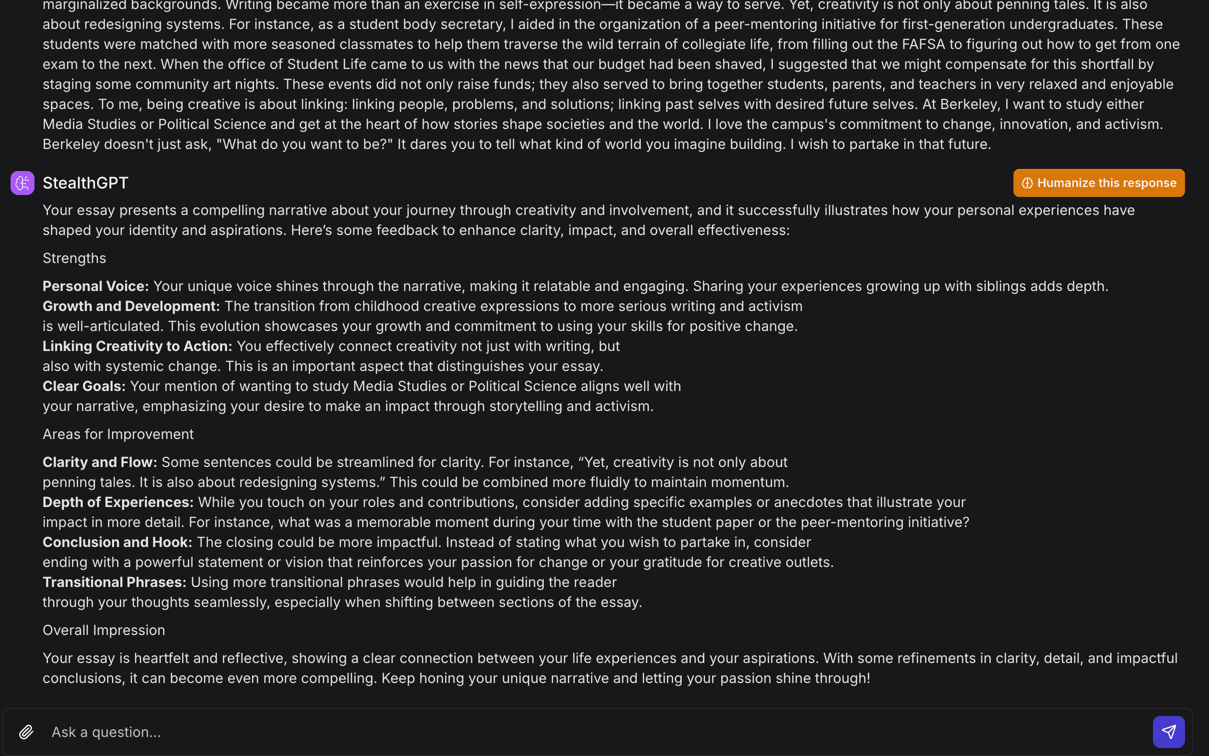 Once a student has implemented as much quality feedback as they can and wiped out any errors, they should make sure to pass the essay through StealthGPT's AI checker to check if their work will be flagged for AI or not.