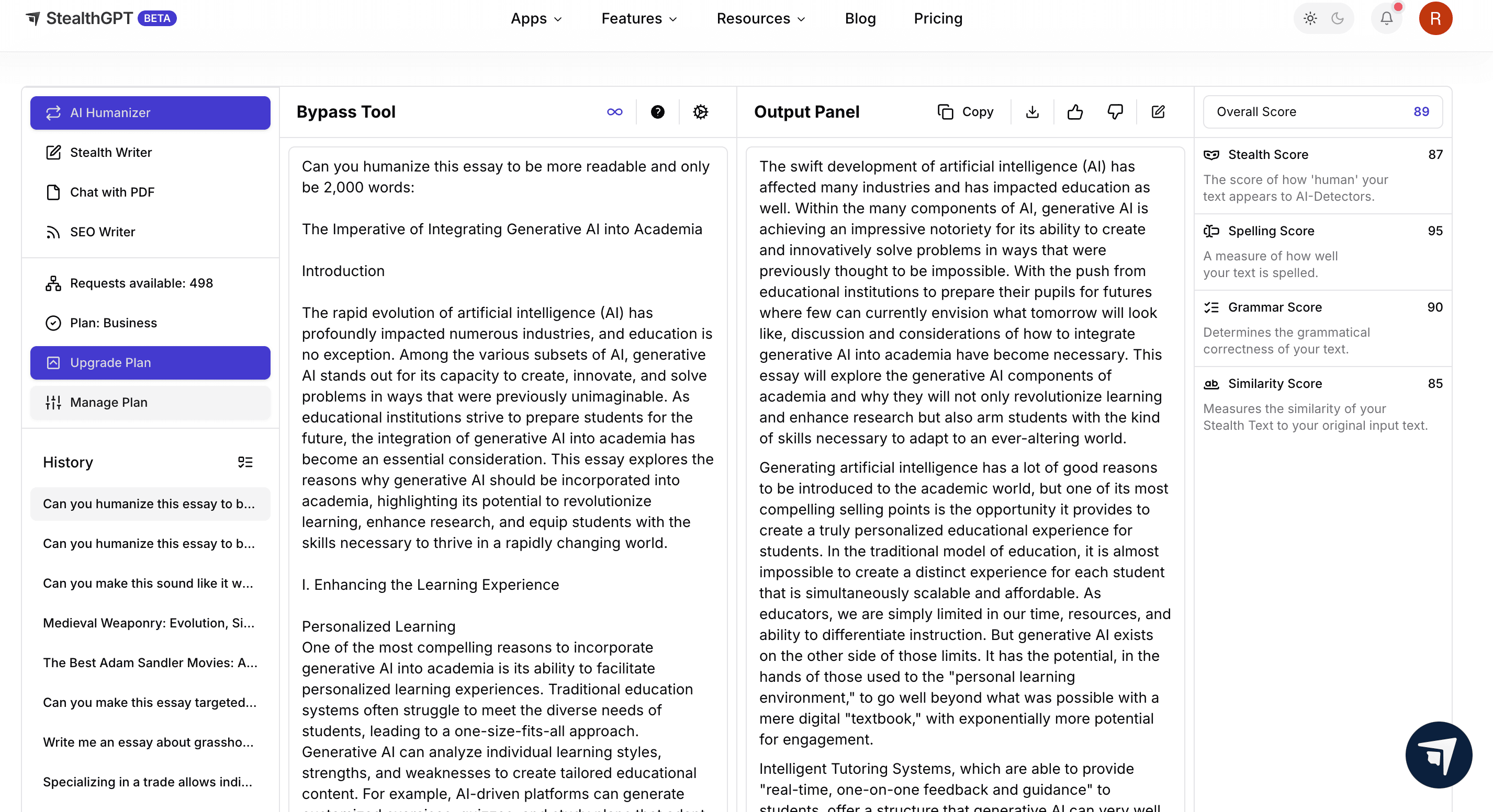 Whether you had ChatGPT to write an essay that you need to be humanized or you want to use Stealth Writer to generate your essay from scratch, StealthGPT is a one stop for all your academic writing needs.