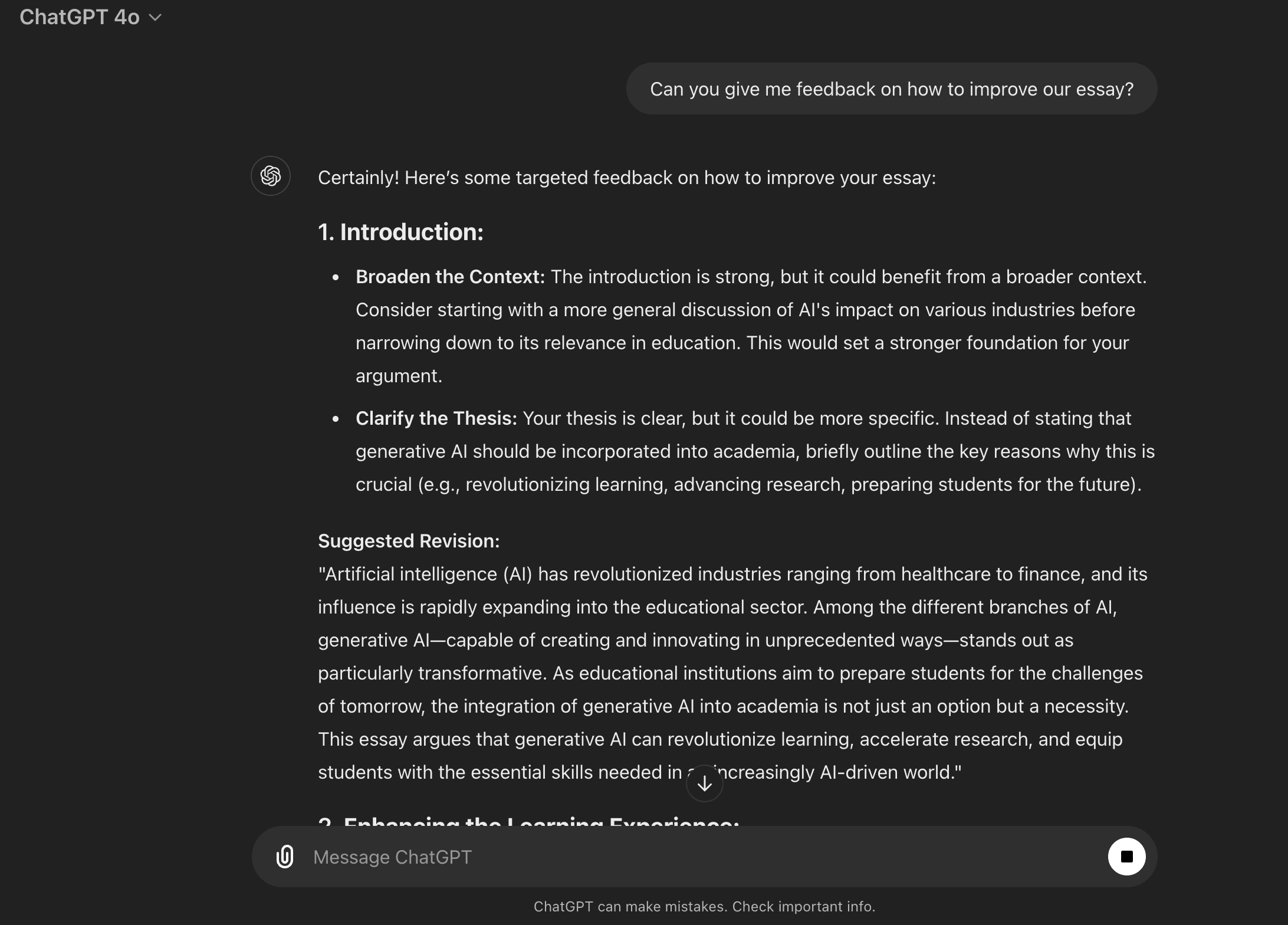 The first thing you can do is ask AI to critique it for you and even fix it accordingly. I had ChatGPT write an essay about AI in academia, here's what it thought of it's own work: