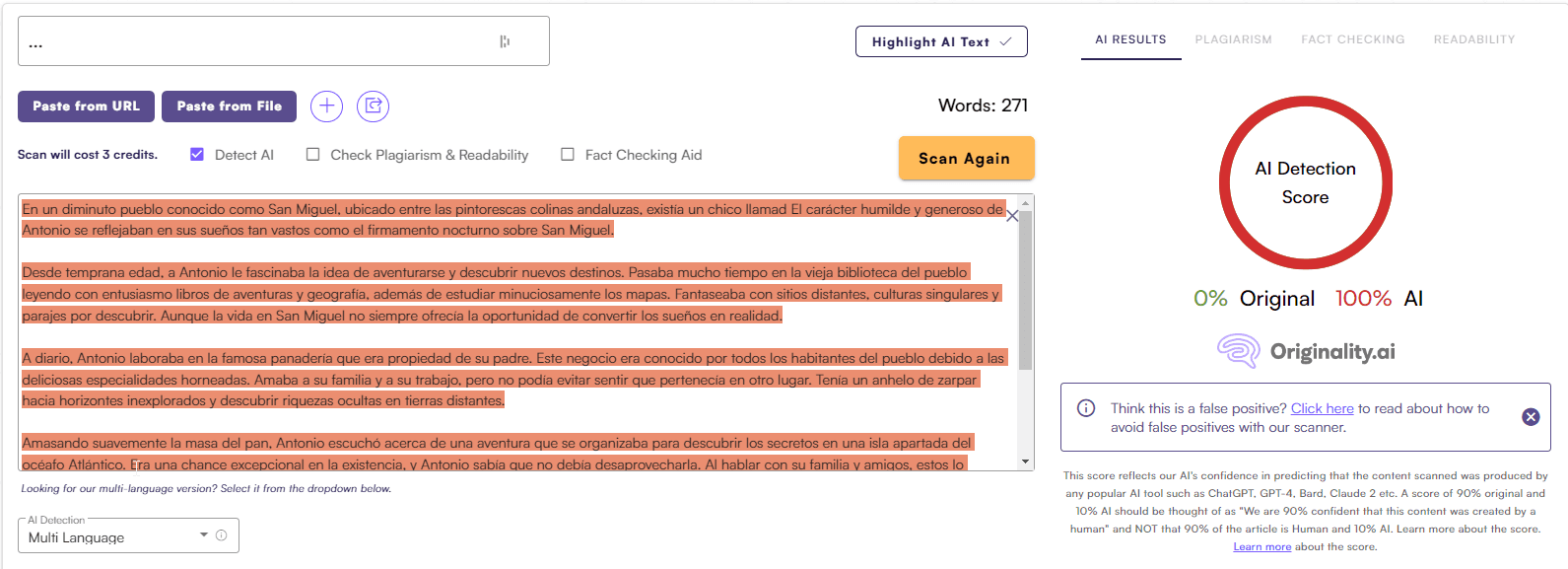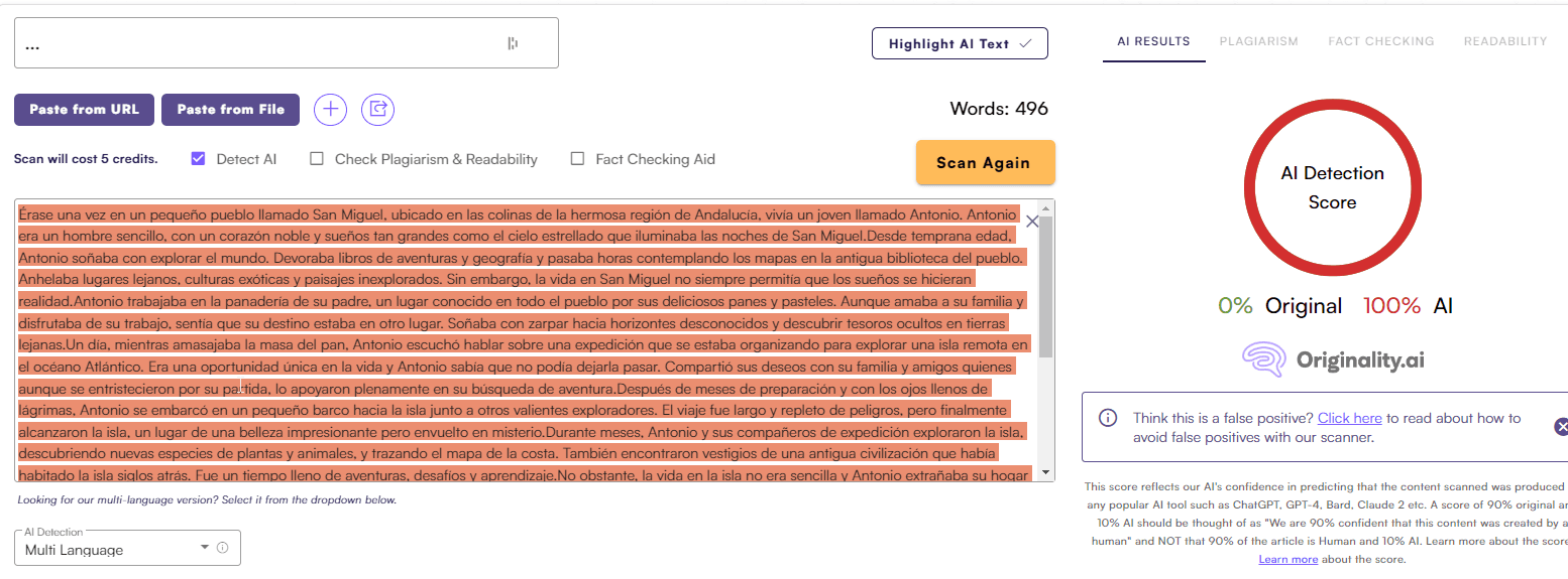 Actualmente, Originality AI es uno de los únicos modelos de Detección de IA con una configuración de detección multilingüe. Veamos si este texto elude su modelo: