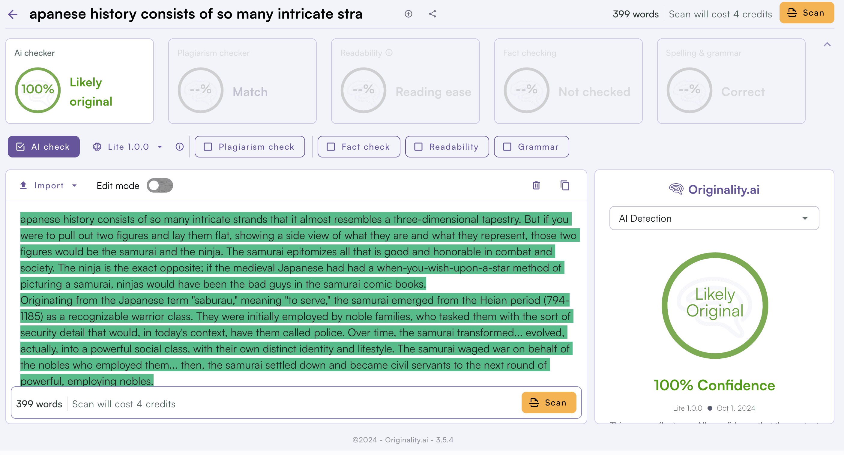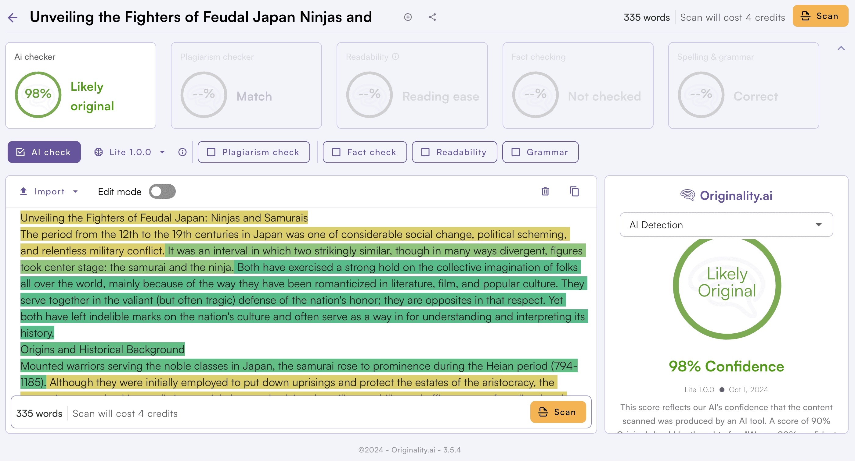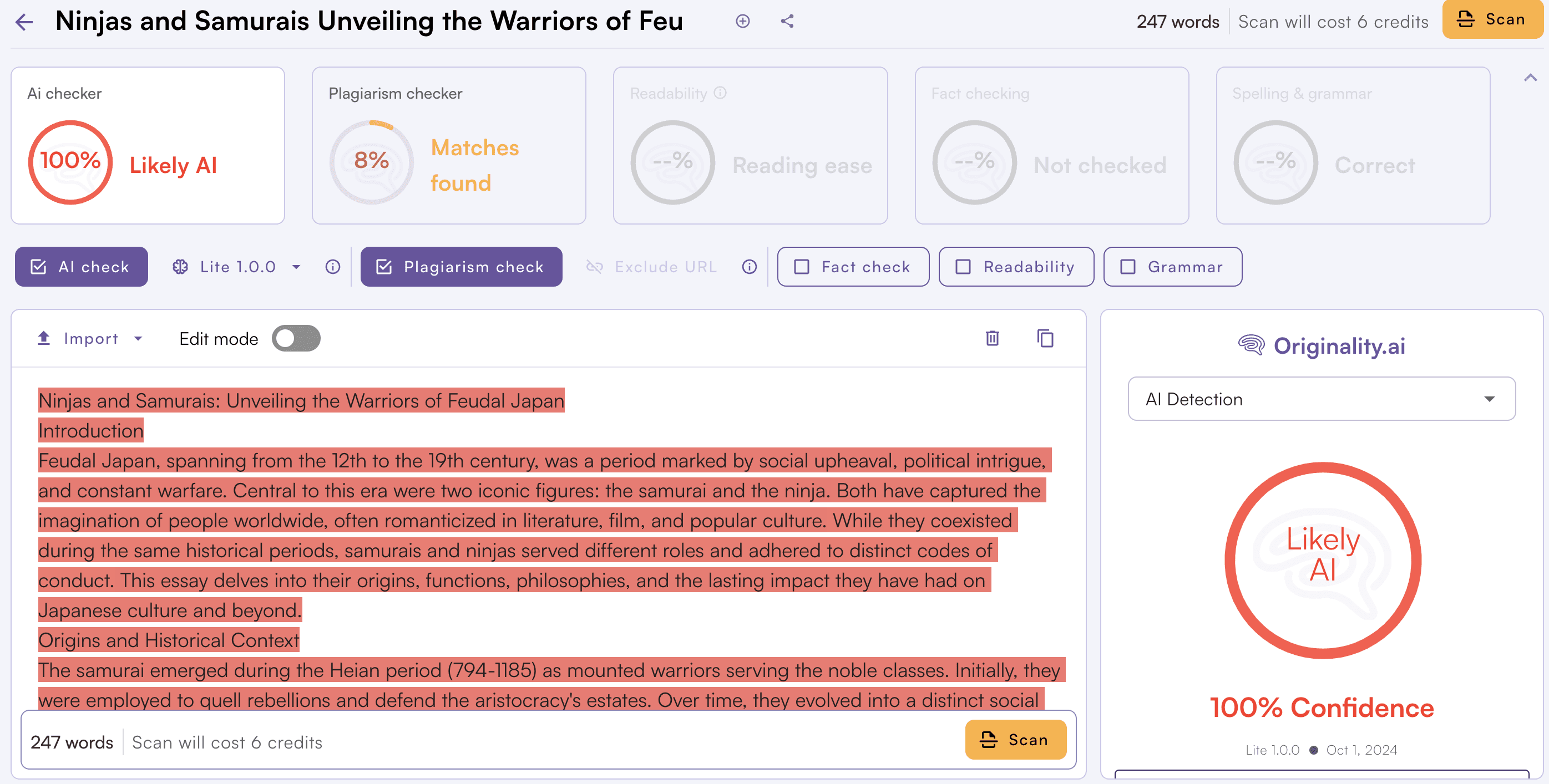 Now that you know the players, lets begin our game. OpenAI just released two new models of ChatGPT, so I’m going to run the new o1-preview against Originality.AI to see who prevails. Here is our essay from ChatGPT about ninjas and samurais: