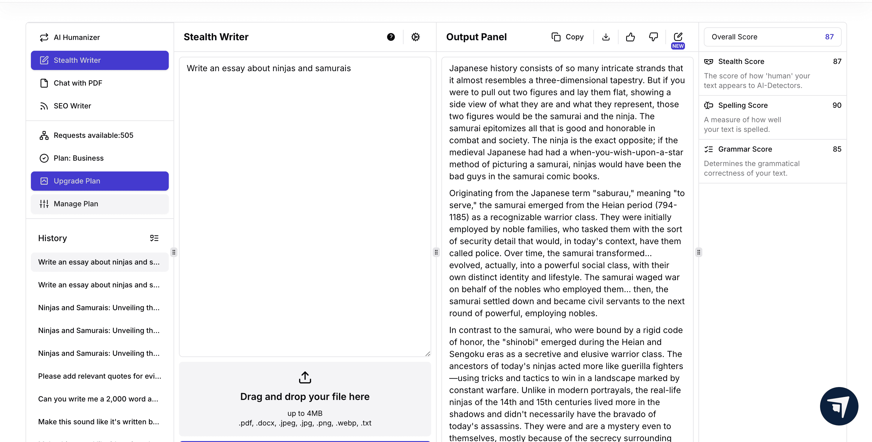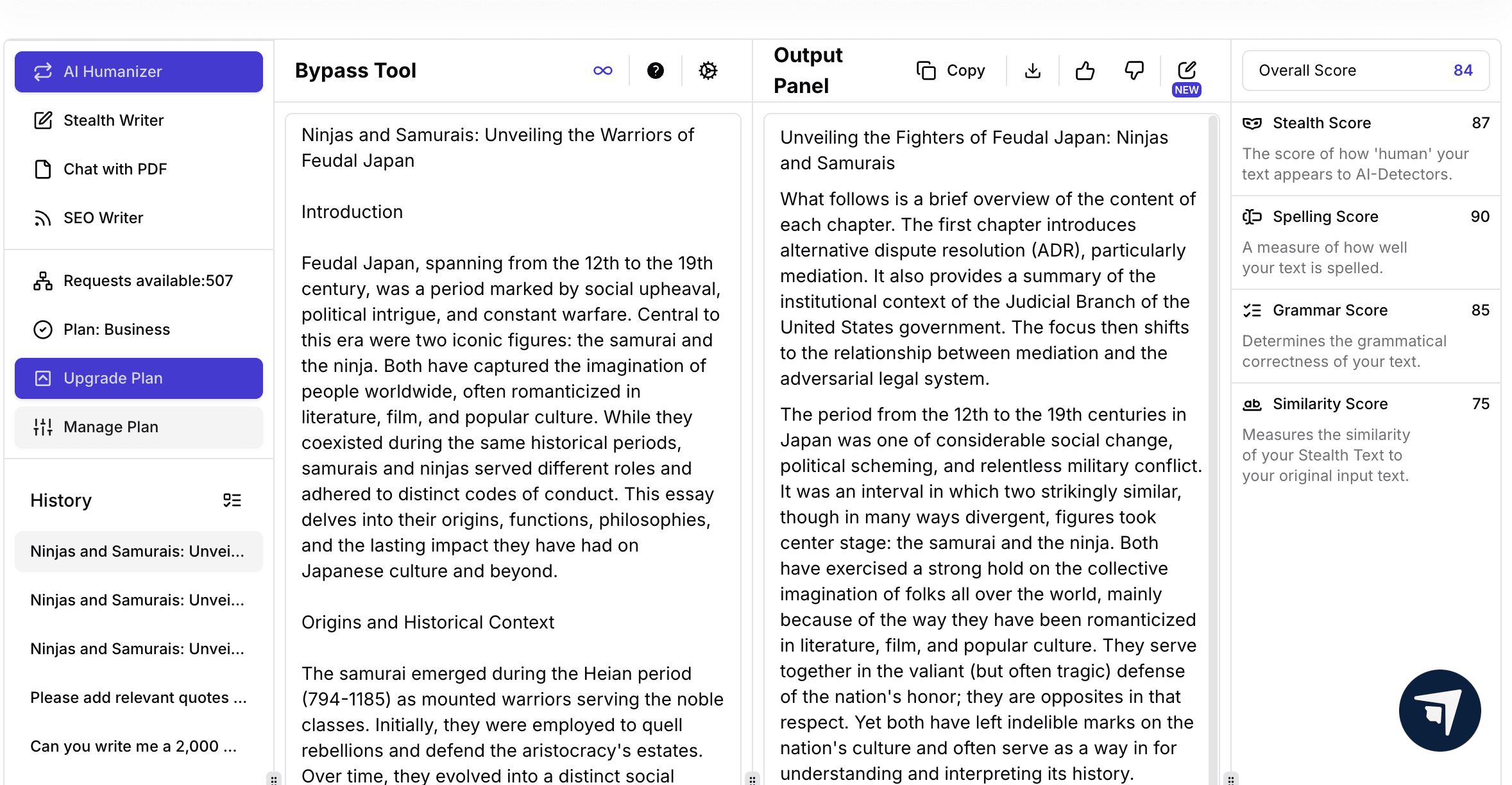 With the AI humanizer proven to be as sharp as ever, lets rev up the Stealthwriter to give us a ninja/samurai essay from scratch and compare the results.