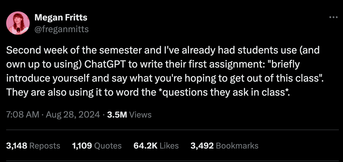Second, that students don’t see the need to put effort into meaningless work. In the replies to Fritt’s now viral X post detailing her story, many of the replies argued that of course students would be using AI for assignments they deemed “busywork”, comparing the use of AI to write essays to using a calculator to solve math equations.