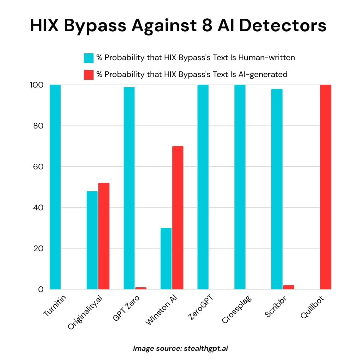 Hix is one of the more popular undetectable AI writers people might recognize scouring the internet for the AI rewriter that suits them. Below, this graph of Hix’s results against the same cross-section of detectors answers " does Hix generate high-quality content?"