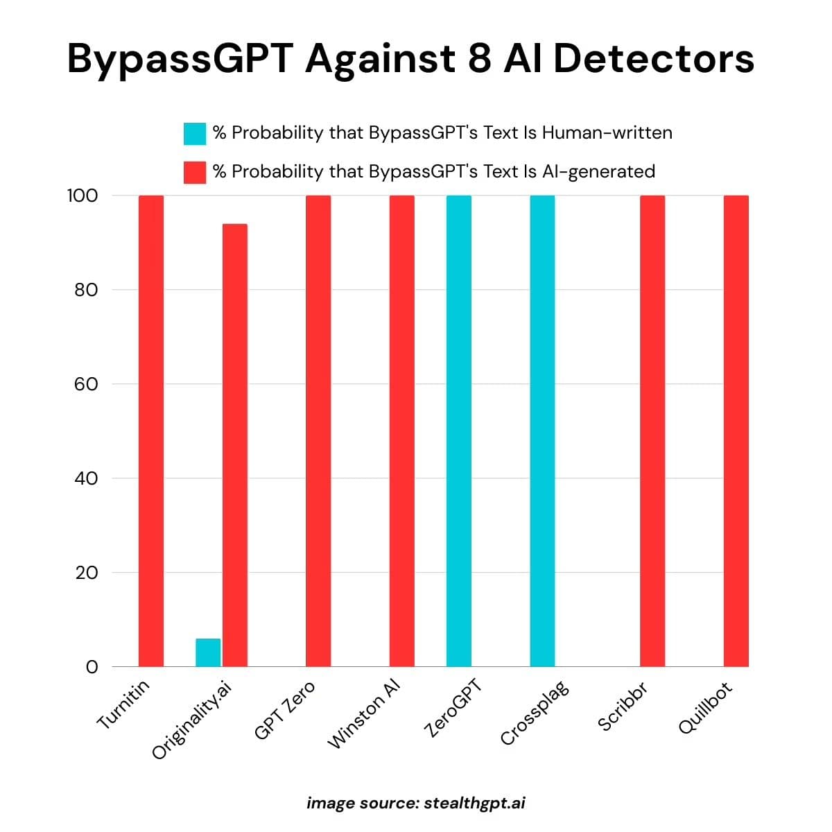 Below is a graph detailing our results from using StealthGPT outputs against a wide variety of AI detectors such as Turnitin, Originality.ai, GPTZero, Winston AI, ZeroGPT, Crossplag, Scribbr, and Quillbot: