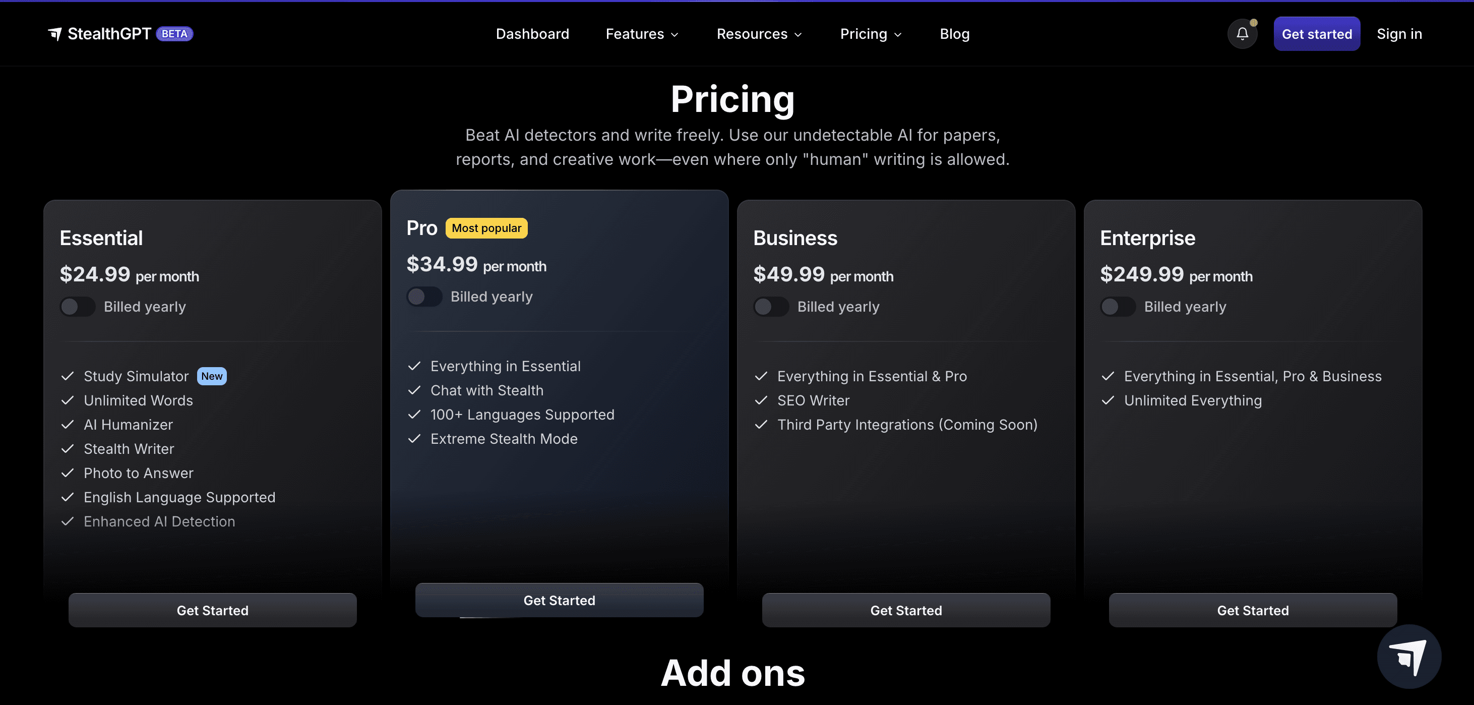 StealthGPT’s unbeatable AI tools come at unbeatable value. With pricing packages that make this software accessible for anyone, StealthGPT also includes a free trial with unlimited word counts as well as staircase pricing to reward customer loyalty.