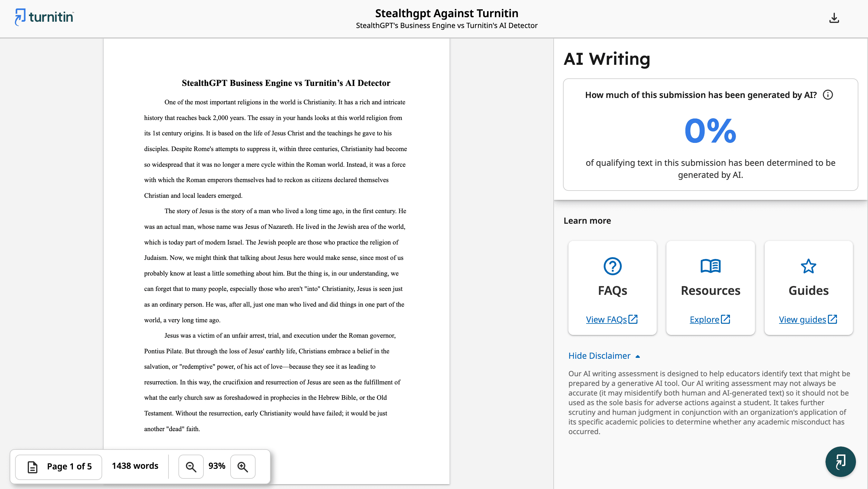 StealthGPT's business engine completely destroys Turnitin's AI detection capabilities with 0% AI writing detected.