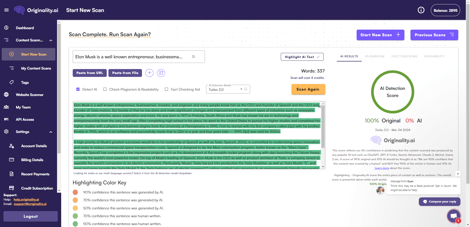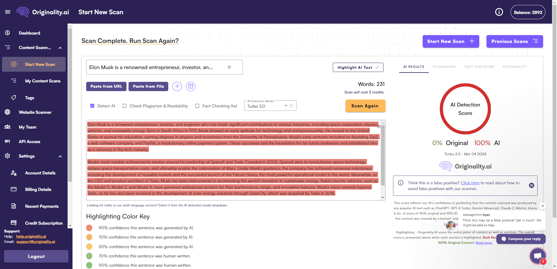 Once again, Claude 3 Opus is caught completely red-handed (literally) by an AI Detector, in this case Originality. Originality is one of the largest and most accurate AI Detectors in the space.