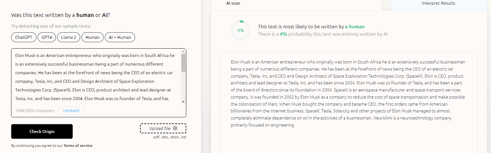 As you can see, the control text was transformed into undetectable content, easily bypassing GPTZero. But our test is not over, let's move to the next AI Detector.